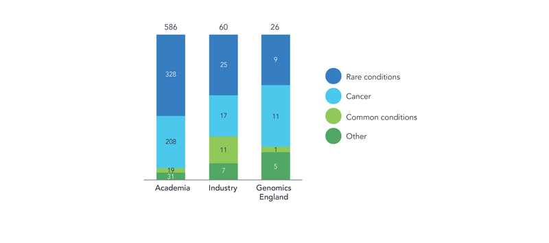 When reviewing the focus of research using NGRL data, it is clear that rare conditions are prioritised. This reflects the distribution of participants’ conditions within the NGRL, with 60% of academic projects and 42% of industry projects focussing on rare conditions.